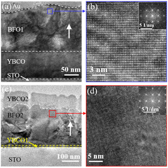 TEM images of the two kinds of samples are shown in Figure 3, indicating the clear interface in the two BFO capacitors. According to the cross section TEM images, the thicknesses of films should be Au(40 nm)/BFO(150 nm)/YBCO(80 nm) and YBCO(70 nm)/BFO(220 nm)/YBCO(10 nm), respectively. Figure 3b, d show the HRTEM of the corresponding BFO in Figure 3a,c. The (001)-oriented growth of BFO may be observed. The FFT is shown in the insert of Figure 3b,d. It shows that there was no amorphous halo in the FFT, excluding the presence of amorphous phase. Figure 3c shows that more grain boundaries exist in the BFO2 than in the BFO1.