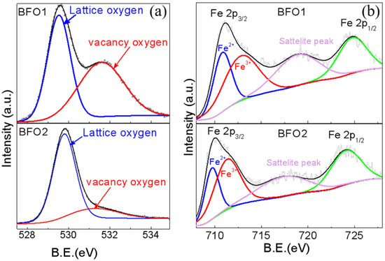 The same conclusion can also be obtained from the XPS analysis of the Fe 2p peaks. Figure 5b shows that, for BFO, two Fe 2p peaks were observed at 710.2 eV and 724.3 eV, which corresponded to the feature peaks Fe 2p3/2 and Fe 2p1/2 of Fe3+. As there were more oxygen vacancies in BFO1 than in BFO2, the Fe 2p peaks shifted to the higher binding energy, i.e., a Fermi level shift [31,32]. This may be because oxygen vacancies increase the balance between electron density and binding energy [33]. The shift in Fermi level is commonly ascribed to the formation of oxygen vacancies, which would enlarge the equilibrium electron density, and thus, push the Fermi level upward [33]. Fe oxidation could be investigated by XPS. By fitting the peaks for the oxidation state of Fe ions in the XPS spectra, the Fe3+ in BFO1 was more than that in BFO2, which revealed the oxidation state in BFO1. The ratios of Fe2+ to Fe3+ in the BFO1 and BFO2 films were calculated as about 31:69 and 40:60, respectively. This demonstrated more oxygen vacancies in BFO1 compared to BFO2, as shown in Figure 6a,b.