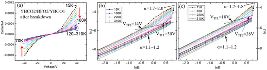 (a) Current versus voltage curves of a YBCO2/BFO2/YBCO1 capacitor after breakdown at a temperature ranging from 15 K to 310 K. The corresponding lnJ versus lnE curves of the positive bias voltage (b) and the negative bias voltage (c).