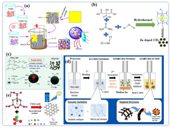 Several bottom-up approaches have been extensively adopted for the creation of metal-doped CDs because of their low cost and better efficiency. CDs have been synthesized by solvothermal reactions of carbon-based materials and metallic salts to contain ions of silver [64], manganese [65], copper [49], magnesium [66,67], cobalt [68], zinc [69], gadolinium [28,70] and chromium [71]. As an example, aqueous GQDs (graphene quantum dots, which is the same as CDs) (0.1 mg/mL) were prepared by using an electrochemical cyclic voltammetry instrument [66]. Following this, a series of AgNO3 fresh aqueous solutions (0.1 mol/L) with measured volumes (5–60 mL) were added to CD (GQD) solutions (2 mL), respectively, and the above mixtures were stirred for 1 h to form a homogeneous solution of Ag-GQDs [64]. The resulting mixtures were then illuminated by UV light at the wavelength of 365 nm (18 W) from a distance of 20 mm for 3 h. When the photochemical reaction was completed, the color of the solutions transformed from yellow to brownish red (depending on the volume ratio of GQDs to Ag ions), indicating that Ag NPs had been formed [64]. The silver-doped CD (Ag-CD) nanoparticles on silica were engineered (Figure 3a) to form highly active surfaces enhanced by Raman scattering [64]. A number of researchers have also synthesized Zn-doped CDs for biomedical applications [69,72,73,74,75,76]. Dehydration, coordination, and carbonization are the steps required to synthesize Zn2+ doped CDs (Figure 3b) according to Cheng et al. [69]. In detail, Zn2+-doped CDs were prepared by dissolving citric acid, urea, and ZnCl2 in toluene. The resultant mixture was transferred to an autoclave hydrothermal reactor and heated at 200 °C for 12 h. It was then allowed to cool to room temperature. The brown solution obtained after the hydrothermal reaction contained the Zn ion-doped CDs. Evaporating the solvents led to the formation of solid samples, and the Zn2+ doped CDs showed excellent solubility in many organic solvents, as well as in water. In addition, we applied the as-synthesized Zn2+ doped CDs with intense bright yellow PL to a variety of applications. Additionally, Figure 3c shows different metal-doped CDs (M = Ga, Sn, Zn, Bi, Au, and Ag) and carbon dot-decorated substrates (Figure 3c) [4]. CDs were doped with low melting point metals by sonicating the molten metal overlayered with polyethylene glycol 400 (PEG-400) (PEG-400) [14,77,78]. The formation and doping of the CDs occurred simultaneously, and the effects of several experimental parameters, such as reaction temperature (4–150 °C), sonication duration (3 min–3 h) and sonication amplitude (40–70%), [37] were studied [79]. Doping the CDs with metallic Ga, In, Sn, Pb, Zn, Au or Ag was performed by ultrasound irradiation without the use of any catalyst or post-acid/base treatment [12]. Ga-doped CDs were also decorated with Ga nanoparticles and given the terminology Ga@CDs@Ga nanoparticles. Unlike the other reported synthetic routes for Metal@CDs the sonochemical synthesis. Sonications is the only direct technique for the preparation of Metal@CDs. Likewise, Sn-doped CDs [80] was synthesized by sonochemical reaction of polyethylene glycol-400 and metallic Sn as a precursor [78,79]. It yielded both Sn@CDs@Sn nanoparticles and Sn@CDs as depicted in Figure 3d. In a recent study, Xu et al., synthesized manganese-doped CDs (Mn-CDs) that demonstrated ultrahigh quantum yield of 54% for metal-doped CDs (Figure 3e) [76]. The Mn-CDs nanomaterials were prepared by a facile hydrothermal synthesis route using sodium citrate and manganese carbonate as the precursors and citric acid as an auxiliary agent. The materials displayed bright blue fluorescence and the capability to switch their luminescence on or off in the presence of compatible ions [76]. Taking advantage of the superior reversible fluorescence properties of the Mn-CD, Xu et al., developed a reusable universal flourescence particles for the nanomolar detection of a mercury ion in simulated polluted water samples [76]. Moreover, Duan et al., described a facile solid-phase synthesis method for the Cu-doped CDs nanomaterials using citric acid as the carbon source and Cu(NO3)2·3H2O as the dopant materials, respectively [49]. These Cu-CDs show superior peroxidase-like activity to horseradish peroxidase and were stable under a wide range of pH and temperatures [49].