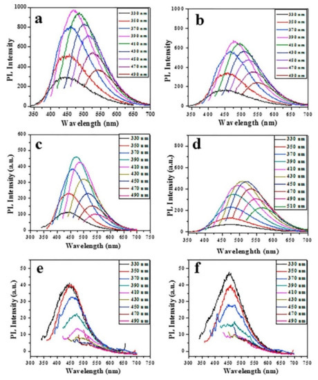 Fluorescence spectroscopy of (a) Pristine CDs (b) Ga-doped CDs, (c) Zn-doped CDs, (d) Sn-doped CDs, (e) Ag-doped CDs, and (f) Au-doped CDs at various excitation wavelengths. Copyright with permission from Ref [12]. (2019), from Elsevier.