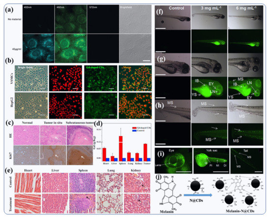 Kumar et al., presented a single-step synthesis strategy for N-doped CDs (N@CDs) with high quantum yields (44%), better photostability, high colloidal stability and excellent functionalization efficiency [15] In addition to their cost effective, the N@CDs were non-toxic and long-lasting when used for live-cell imaging of human U2OS cells (Figure 10a). Due to their high biological stability, high tissue compatibility and homogenous dispersal, the N@CDs suspension was used for high-quality cell imaging and to model the biological effects on the nuclear level [15]. Gd-doped CDs were found to be useful as theranostic agents, as demonstrated by Du et al. [70]. An MTT (3-(4,5-dimethylthiazol-2-yl)-2,5-diphenyltetrazolium bromide or MTT) assay was used to test Gd-doped CDs for their nontoxicity to human adenocarcinoma lung cancer cells and vascular smooth muscle cells (VSMCs) [8,9.131]. Furthermore, bright-field images showed no morphological modification after Gd-doped CDs treatment, thus suggesting good biocompatibility [70]. Using the fluorescence property of the Gd-doped CDs, Du et al., evaluated their uptake into living cells [70]. The labeled cells (HepG2 cells and VSMCs) exhibited a green fluorescence produced by Gd-doped CDs dispersed in the cytosol (Figure 10b) [70]. They used H&E cell line and anti-Ki67 Z (cancer cell marker), to confirm the diagnostic accuracy. Figure 10c depicts the H&E and immunohistochemistry images that confirmed the accurate detection of Gd-CDs enhanced MRI analysis showing pathological tissue changes along with hepatocellular cancer cell in the subcutaneous (skin) tumor samples and liver. Studies have shown that Gd-CDs are extremely sensitive for MRI imagining of tumors [70]. A number of studies showed that long circulation times are beneficial to passive targeting of solid tumors through leaky vasculature. The understanding of the Gd-CDs’ biodistribution behavior into the major tissues would be crucial for their further in-vivo medical applications [70]. An ICP-MS analytical tool was used to examine the metabolism and distribution of Gd-doped CDs in vivo (Figure 10d). Particles have a significant uptake in the spleen and heart for 24 h after injection for the bio-imaging. The extremely small size inorganic nanoparticles (less than 5 nm) allowed a percentage of the particles to escape to recognition by the reticuloendothelial system and collect in different organs such as the liver, lung, and kidney. There may be differences in the distribution of Gd-CDs due to the abundant blood supply in the heart and the presence of the reticuloendothelial system in the spleen. Moreover, the Gd-CDs did not cause apparent adverse effects, such as tissue injury, swelling or lesions when compared to the control group after 7 days post-injection (Figure 10e) [70]. Furthermore, N-doped CDs are very stable, long-lasting and have no detectable toxicity [88,89]. Using N-doped CDs, Kumar et al., validated this concept on zebrafish (ZF) embryos, which were incubated in aqueous solution containing N-doped CDs, as shown in Figure 10f [88]. As a result of their ultrafine size, N-doped CD particles readily enter into ZF embryos through the germ ring around the yolk sac and chorion of embryo during incubation. The ZF embryo chorion pores’ size is 170 nm, which is much larger than N-doped CDs (~5 nm) and allows the penetration of CDs. At 24 hpf (hours post fertilization), ZF embryos exposed to 6 mg mL−1 N-doped CDs solution exhibited strong fluorescence in the yolk sac, trunk and tail region, indicating the tissue-dependent affinity of these CDs [88]. The other remaining portions of the embryo (zebra fish) exhibited weak N-doped CD fluorescence emission at 24 hpf (Figure 10f) [88].