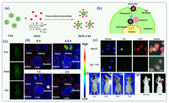 (a) Schematic representation of functionalized DOX-CD covalent ineteractions [141]. (b) The DOX-hollow CDs drug delivery system illustrates the intracellular release of DOX [142]. (c) An animal fluorescent imaging test using CDs was performed in vivo [141]. In (d), mice were imaged ex vivo after intravenously injected CDs at various times [141]. (e) under confocal microscopy, CD-DOX is endocytosis and then released into the cytoplasm. During cell nucleus death, Hoechst is responsible for the blue fluorescence, while CDs produce green-yellow fluorescence, and DOX drugs themselves are responsible for the red fluorescence [143]. (f) After intralesional injection, a photo of the HCC tumor site can be seen for a different period of time [143]. (g) Image of an in vivo fluorescence imaging of C-nude BALB/c-nude mice bearing HCC [143]. Reproduced with copyright permission.