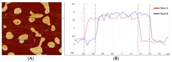 Two MEG sheet sections were used as samples to measure the MEG thickness by atomic force microscopy; the test results are shown in Figure 4.
