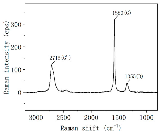 Defects are also an important indicator of MEG properties. To further investigate the condition of defects within the face of mechanically exfoliated MEG, MEG was analyzed using Raman scattering spectroscopy. The Raman spectra of mechanically exfoliated MEG samples are shown in Figure 5. There are three Raman bands at approximately 1355 cm−1 (D), 1580 cm−1 (G) and 2710 cm−1 (G’). The intensity of the G peak is higher than that of the G’ peak, while the G and G’ peaks are red- and blue-shifted, respectively. This indicates that this MEG sample has a multilayer structure, and the number of layers is greater than four [16]. The number of MEG layers can be estimated to be 6 by measuring the G-peak intensity [17], which is in good agreement with the AFM measurements. The D-peak in the spectrum characterizes the structural defects in MEG, and the intensity ratio nD of D-peak to G-peak characterizes the defect density in MEG, with the relation shown in Equation (1) [18]: