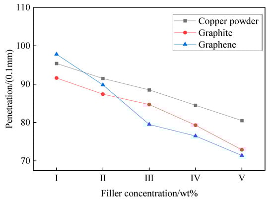 From Figure 7, it can be found that the filler content has a great influence on the cone penetration of EJC, and the cone penetration of all three groups of compound grease samples showed a decreasing trend with the increase of filler content. Among them, the cone penetration of MEG power grease decreased the most significantly with 26.4. The cone penetration of graphite power grease and copper powder power grease decreased by 18.7 and 14.9, respectively. The reason is that the cone penetration is influenced by the particle size and specific surface area of the filler: the larger the specific surface area and the higher the hardness of the material, the greater the reduction of the cone it becomes. The specific surface area of the conductive filler used in the experiment is copper powder < graphite < MEG, which is consistent with the experimental data. The cone penetration mainly reflects the softness and hardness of EJC, and the range of cone penetration in engineering application is between 70 and 90. If the EJC is too soft (cone penetration >90), the viscosity of the grease is low, and it is easy to be lost under high temperature. If the EJC is too hard (the cone penetration is less than 70), it is easy to blister and dry up during the actual application process, resulting in incomplete contact with the electrical connection position. From the experimental data, it can be seen that the penetration is within a reasonable range when the MEG content is 2 wt%–4 wt%, that the MEG has a high penetration adjustment rate and adjustment range and that a small change of MEG content can effectively adjust the penetration, which is conducive to help balance the properties of EJC.