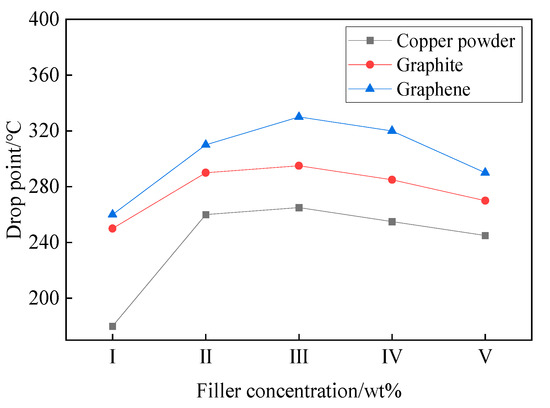 The higher the dropping point is, the more stable the performance of the grease in the high-temperature environment. When the grease works at a temperature higher than its own limit, it will cause the separation of oil and grease and lead to the failure of the grease. The factors that affect the dropping point size are mainly the performance of conductive filler, the performance of base oil, the performance of thickener and the control of preparation process. The experimental measurement of different filler concentration–dropping point relationship is shown in the Figure 8.