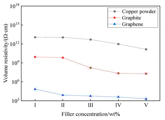 When the EJC works normally, there are mainly two types of conductive methods: one is that some of the conductive particles will be in direct contact, forming a continuous chain-like conductive path, and the other is that some of the conductive particles are very close to each other, forming a tunneling current under the action of “tunneling effect” [19]. Volume resistivity is the impedance of a material to current per unit volume. It can effectively characterize the ability of conductive fillers to build conductive pathways and form tunneling currents. The volume resistivity–filler concentration relationship is shown in Figure 9.