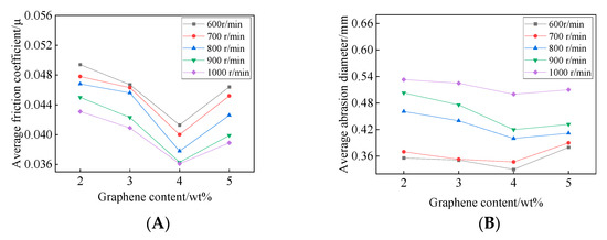 The relationship between the frictional properties of the EJC and the MEG content at different rotational speeds under a fixed load of 392 N is shown in Figure 10.