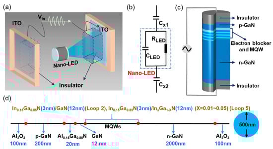 Schematic structure of the nano-LED operating in NEC&NCI model is demonstrated in Figure 2a, where the nano-LED is sandwiched between two insulting layers. The external electric field generates an electric potential drop in the nano-LED, which would drive the inherent carriers to recombine at MQW [31]. Obviously, the device is equivalent to a resistor-capacitance (RC) parallel circuits [11,12]. As shown in Figure 2b, RLED is the internal resistance of the nano-LED, and CLED is the capacitor related to PN junction. Cx1 and Cx2 are equivalent external capacitors, which are related to the insulating layers on both sides.