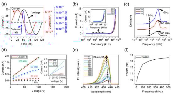 The relationships between the peak current and frequency (i-f) at different voltage amplitudes are presented in Figure 3b. In particular, the detailed current-voltage relationship at low frequencies is shown in the inset of Figure 3b. Consistent with experimental results, the current increases exponentially with the increase in frequency [11]. According to differential calculation results, the detailed change of the peak current can be observed more visually, as shown in Figure 3c. In the low frequency range (<1 MHz), the current remains basically unchanged. At frequencies above 1 MHz, the current increases obviously, and maximum increasing rates can be obtained at ~500 MHz (30 V), ~800 MHz (50 V), and ~1 GHz (70 V), respectively. These numerical calculation details can help explain important device characteristics, such as the optimal frequency point for the emission rate and power efficiency, which will be analyzed in the following section.