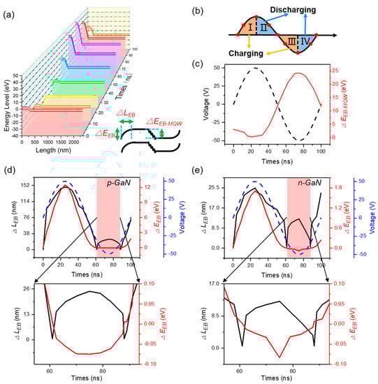 During the increasing process of forward voltage (process I in Figure 4b), the capacitors of CX1 and CX2 are charging. The holes in the p-GaN region and the electrons in the n-GaN region diffuse into MQW, respectively. In this case, depletion regions are formed on both sides of the semiconductor (ΔEEB > 0). Therefore, energy bending in the p/n GaN terminals can be observed. The values of ΔEEB and ΔLEB reach the maximum at the peak voltage, as shown in Figure 4d,e. Quantitatively, the maximum values of ΔEEB-p and ΔLEB-p in the p-GaN terminal are 12.504 eV and 148.4 nm, respectively. The maximum values of ΔEEB-n and ΔLEB-n in the n-GaN terminal are 1.705 eV and 24.4 nm, respectively. It should be noted that because the doping concentration of p-GaN is lower than that of n-GaN, more obvious energy bending can be observed in the p-GaN terminal. Since the PN junction is in a forward-biased state, the change in ΔEEB-MQW is relatively small, as shown in Figure 4c. The maximum value of ΔEEB-MQW is only 0.259 eV.
