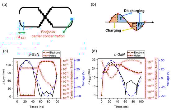 Change of the carrier concentration in p-GaN/n-GaN terminals. (a) Definition of ΔLcc. (b) Schematic charging and discharging process of the equivalent capacitance. (c) Carrier concentration in the p-GaN terminal. (d) Carrier concentration in the n-GaN terminal.