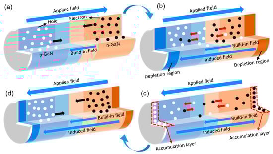 In the process of increasing the reverse voltage (process III in Figure 5b), the moving behavior of carriers is similar to the process II. pp and the nn increased, as schematically demonstrated in Figure 6c. Finally, the depletion region of the p/n-GaN terminals disappear (The pp is 7 × 1017/cm3 and the nn is 5 × 1018/cm3) and the accumulation layer is formed, as shown in the red regions in Figure 5c,d. The maximum pp and nn are 1.3706 × 1019/cm3 and 1.9001 × 1019/cm3 respectively. The maximum ΔLcc-p in the p-GaN terminal and ΔLcc-n in the n-GaN terminal are 20.923 nm and 13.4 nm, respectively. The minimum np and pn are 1.2791 × 10−32 cm3 and 60.338/cm3, respectively. The accumulation process of carriers is the most important in process III. In order to provide enough carriers to participate in light emission in the next cycle, the accumulation time can be increased to make carriers move toward p/n-GaN terminals as much as possible.