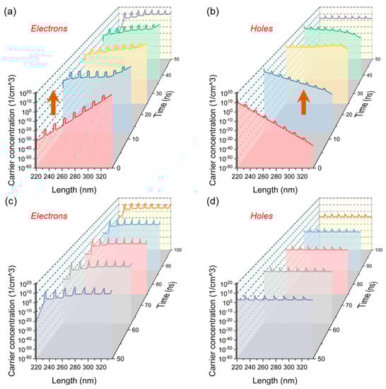 As the forward voltage decreases (25–50 ns), the induced electric field is formed and shields the applied field. As a result, the value of the carrier concentration in MQWs slightly decreased. When voltage reduces to 0 V, the orders of magnitude of electrons and holes concentration are 1015/cm3 and 107/cm3, respectively. As the reverse voltage is increasing (50–75 ns), the majority carrier concentration in MQW further decreases until the terminal carrier concentration reaches the maximum. At this time, the orders of magnitude of electrons and holes concentration are 1012/cm3 and 102/cm3, respectively. In the remaining period of time (75–100 ns), the concentration of electrons and holes remain basically unchanged, as shown in Figure 7c,d.