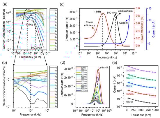 Frequency response characteristics of the device. (a) Carrier concentration in the MQWs at different frequencies. (b) Carrier concentration in the MQWs at 1 MHz. (c) Emission rate and the power efficiency at different frequencies. (d) Emission rate with different insulator thicknesses at different frequencies. (e) Peak current with different insulator thicknesses at different frequencies.