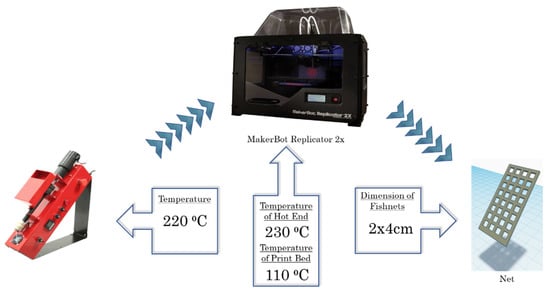 Flat, rectangular-shaped “fishnet-like” grid 3D structures (2 cm × 4 cm) were designed using “Tinkercad”, a free online 3D design and 3D printing software from Autodesk Inc. (Mill Valley, CA, USA). A dual-extrusion FDM-type 3D printer (Makerbot Replicator 2X; MakerBot Industries, Brooklyn, NY, USA) was used for the fabrication of the ZnO-ABS nanocomposite samples, using the ZnO-ABS nanocomposite filaments described above. The FMD process of building a solid object involves heating the fed filament and pushing it out layer-by-layer through a heated (230 °C) nozzle (0.4 mm inner diameter) onto a heated surface (110 °C) via a computer controlled three-axis positioning system (with a spatial resolution of approximately 100 μm in the z-axis and 11 μm in x and y). The used printing system and growth conditions are presented in Figure 1.