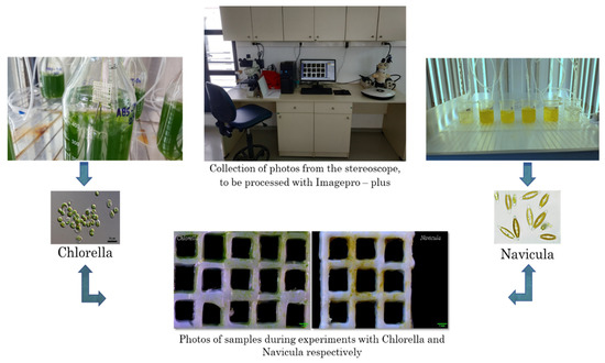 The antifouling action was investigated by monitoring the growth of the diatoms Navicula sp. or monocellular algae Chlorella sp. For this investigation, a chamber was employed in which the plankton cultures were maintained under constant conditions (temperature, light, aeration). Samples were placed in the cultures for a specific period of time. The area covered with algae was estimated using image analysis techniques, as schematically presented in Figure 2.