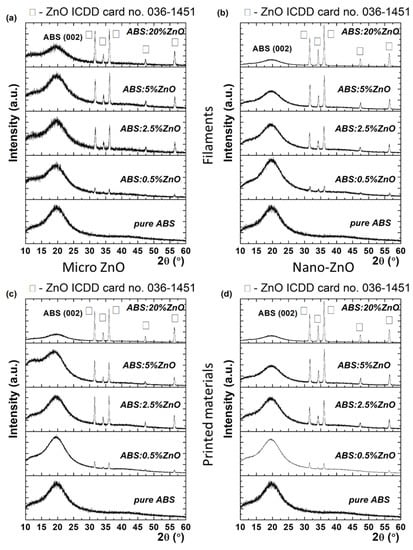 Firstly, the properties of the fabricated filaments were studied and their transfer to the printed material was verified. Figure 3a,b shows X-rays diffractograms of the nano- and micro-ZnO-ABS filaments and printed composite materials, respectively.