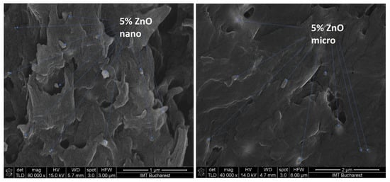 High magnification FESEM for the 5% ZnO nano- and micro- samples; 5% nano ZnO-ABS × 80,000; 5% micro ZnO-ABS × 40,000.