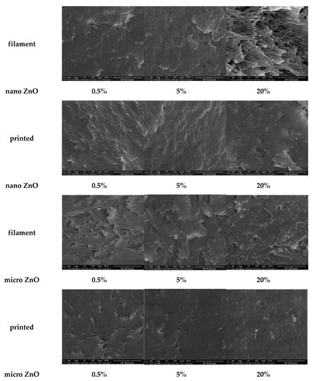 Some examples of the structure of the pure ABS and the 0.5%, 5% and 20% nano- and micro-ZnO-ABS filaments and printed composite materials are shown in Figure 5, where, ZnO particles are also clearly visible onto the surface; in these images, a 20% ZnO particle concentration was used.