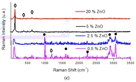 For this purpose, at least 50 Raman spectra were initially collected from different surface areas of each sample and compared. Figure 6 shows the Raman spectra of the 20% micro- and nano-ZnO-ABS printed composite materials (A) and a peak analysis of the Raman spectrum for 20% micro-ZnO-ABS (B). As one can observe, both the nano- and micro-ZnO containing composites showed characteristic peaks of the constituents but, for the nano-ZnO, the corresponding peaks were very weak. Figure 6 C shows some representative examples of Raman spectra for the micro-ZnO-ABS printed composite materials with various ZnO concentrations. Various peaks related to ABS were observed, e.g., at 1000 cm−1, δ (C=C-H) stretching, 1600 cm−1, C=C stretch, 2300 cm−1 and 2900 cm−1 νas (CH2) and νs (CH2) bonds, 3000 cm−1, C=C-H styrene aromatic bending []. Moreover, peaks related to ZnO were observed at 100 cm−1, corresponding to E2(low) symmetry mode, 437 cm−1, the peak of E2(high) mode and 643 cm−1, which was related to the simultaneous excitation of LA + LO phonons []. As the ZnO microconcentration increased, the representative peaks for ABS decreased in intensity. Similarly, at low frequencies, the specific ZnO peaks showed a slight increase in intensity. For nano-ZnO-ABS samples, due to the relatively homogeneous distribution of the ZnO nanomaterial in the ABS matrix, the intensity of the peaks of the materials did not show a significant change.