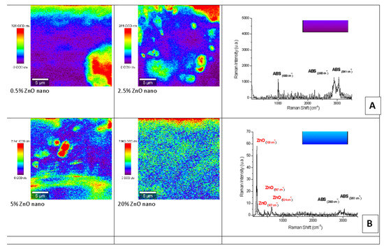 Raman mapping and spectra of nano-ZnO-ABS printed composite materials. (A) Example of Raman spectrum corresponding to mauve-blue dark color regions in the maps; (B) example of a Raman spectrum corresponding to blue color regions in the maps.