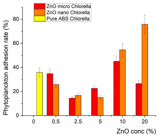 The printed samples were exposed to plankton cultures as described in the Experimental section. It was found that after the incorporation of ZnO in the polymer matrix, the covering of the samples with Chlorella and Navicula was less effective in particular compositions, indicating antifouling action. In particular, for the Chlorella tests, the covering was minimized at a concentration of 2.5% of microsized ZnO (12% coverage), while for the 5% nanosized sample, 15% coverage was recorded, as shown in Figure 8. In contrast, the antifouling action was found to be less effective with Navicula, since the minimum coverage achieved was 25% when micro-ZnO was used (Figure 9). Detailed results regarding the effects of ZnO type and concentration on the covering of the samples with Chlorella and Navicula are presented in Figure 9 and Figure 10.
