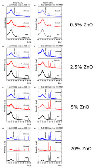 XRD patterns of micro- (a–d) and nano-ZnO-ABS (e–h) for the initial printed 3D grid (black) exposed to Navicula (red) and Chlorella (blue), respectively.
