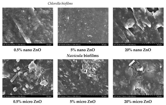 SEM images of Chlorella and Navicula biofilms on the 0.5%, 5% and 20% nano- and micro-ZnO-ABS 3D printed composites, respectively.