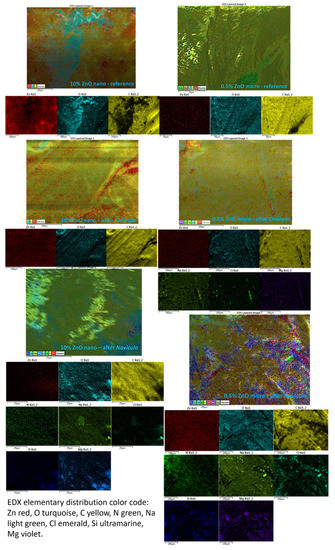 EDX elemental mapping of 10% nano-ZnO-ABS and 0.5% micro-ZnO-ABS, 3D printed composites (reference and after plankton exposure). Large image-composite elemental map followed by individual element mapping bellow.