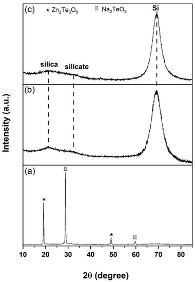 - Ogbuu, O.; Du, Q.; Lin, H.; Li, L.; Zou, Y.; Koontz, E.; Smith, C.; Danto, S.; Richardson, K.; Hu, J. Impact of Stoichiometry on Structural and Optical Properties of Sputter Deposited Multicomponent Tellurite Glass Films. J. Am. Ceram. Soc. 2015, 98, 1731–1738. [Google Scholar] [CrossRef]