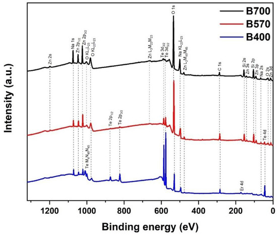 Figure 4 shows the XPS survey scan for samples fabricated using different substrate temperatures. For sample B400, the Te peak was obviously the highest among the samples, proving that tellurite is the predominant host material in the deposited layer. The absence of Si in sample B400 also confirms that there was no reaction in underlying SiO2 layer. For samples B570 and B700, the Er concentration was too low, and it could not be detected in the spectra survey. Er peaks that are often identified from Er 4d overlap with Si 2s peaks, which are more pronounced because of much higher silicon concentrations than the Er in samples B570 and B700. Furthermore, no peaks other than carbon (C 1s) and species from Er-TZN and silica were detected in the spectrum survey obtained. This finding indicated that no contaminants were present in the upper layer. For sample B700, the Te 3d5/2, and Te 3d3/2, peaks were very low compared with those in B570, and Te 2p1/2 and Te 2p3/2 peaks were absent, which validated the argument on the reduction of Te content in EDTS at higher temperatures.