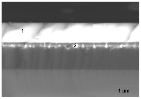 Figure 1a displays a backscattered (BSE) cross-sectional SEM image of bare SOS substrate, while Figure 1b–d show BSE cross-sectional SEM images for samples fabricated when substrates were heated at temperatures of 400 °C (B400), 570 °C (B570), and 700 °C (B700). The thickness of the original silica layer (Table 1) remained at ~1 μm, proving that no doping process actually occurred for sample B400, and the layer obtained was only typical deposited film. This finding indicated that a temperature of 400 °C is insufficient for the incoming plasma plume to modify the strong covalent bonds of silica. The film formed on the SOS was only Er-TZN glass film, with compositions presented in Table 2, where the Te concentration was much higher than the Si concentration. The surface for the B400 sample appeared to be very rough with clusters of microparticles. Such film is unsuitable for EDWA because it could cause significant surface scattering and ultimately propagation loss for laser signals.