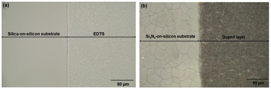 An area scan was performed to view the entire elemental distribution present in K600 (Figure 12). The elements were clearly distributed unevenly. Surprisingly, the concentration of N in the doped layer was very low compared with its concentration in Si3N4, which was supposedly around ~57.1 %. Nitrogen was considered lost in the form of nitrogen gas when the tellurite glass reacted with Si3N4, and this phenomenon was also reported by Watanabe et al. [51]. Failure to obtain a very uniform doped layer, such as in the case of EDTS, was probably due to the substrate temperature not being sufficiently high. The melting temperature of Si3N4 (1900 °C) was higher than that of silica (1710 °C). Therefore, higher temperatures may be required to allow the dissolution of Er-TZN into Si3N4 with homogeneous layer formation. Additionally, the failure to obtain homogeneously doped layers may be due to the SiO2 amorphous network, which is somewhat different from Si3N4. Unlike the local structure of silica, which contains adjustable and flexible Si-O-Si- bridging bonds, Si3N4, consists of Si-N-Si bonds that are rendered rigid as N requires bonding with three Si rather than two to form a stable configuration. As a consequence, its network structure is much more constrained than that of silica [52], making it difficult for the elements from Er-TZN to diffuse into Si3N4 and modify it. This leads to the formation of pores and cavities and the accumulation of certain elements for Si3N4 samples. A higher temperature could be expected to help loosen the strong Si-N bonds. Nonetheless, the more rigid Si3N4 structure caused it to have higher internal stress levels and thus to crack more easily. This problem was not observed for samples fabricated using an SOS substrate. Figure 13a,b show the surface images of samples that used different substrates (SiO2 and Si3N4) with the same process parameters and target material. The images were taken under an optical microscope near the edge of the doped layer. The findings clearly showed that the undoped Si3N4 layer on silicon cracked after the sample fabrication process.