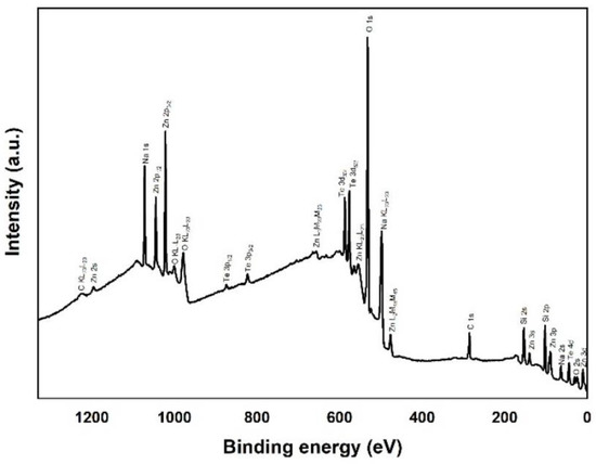 Table 2 tabulates the element concentration for the surface layer of samples B400, B570, and B700, as calculated using a high-resolution scan of O 1s, Si 2p, Na 1s, Zn 2p3/2, Te 3d5/2, and Er 4p3/2. Even though the value for the element concentrations derived from XPS was slightly different from EDX-SEM, the trend was still quite similar. Figure 5 shows a high-resolution scan of Te 3d5/2 for a sample fabricated with varying substrate temperatures. As expected, the high-resolution scan of Te 3d5/2 for B400 was slightly different from that of the EDTS. No Te metal could be detected for this deposited layer, indicating that the amount of oxygen is sufficient in the layer. Surprisingly, TeO3 was dominant in this network. The peak located at ~574 eV is typically attributed to tellurium suboxide [37,38]. For the B700 sample, the low density of the tellurium species in EDTS made the scan results have much noise and made deconvolution processes difficult, possibly causing it to be less accurate.