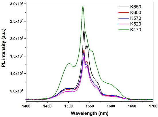 The PL emission spectra for the samples are shown in Figure 17. For K470, the FWHM of the spectra was broader than that of the others, also indicating that the upper layer was a tellurite-based material. The low PL lifetime (4.97 ms) and an FWHM value of approximately 33 nm (Table 6) obtained were comparable with those reported for tellurite glass [24,55]. As shown in Table 6, samples K520, K570, K600, and K650 had a PL lifetime of between 9 and 10 ms and FWHMs of 20 nm. This finding indicated that the doped layer was silicate based, as with the EDTS. If the doped layer is Si3N4 based, it could show a lower lifetime in the range of 0.2–7 ms with an FWHM broader than that of a typical Er-doped silicate-based material [56,57,58]. As shown in Table 6, the higher PL intensity and the lower lifetime of samples prepared at higher substrate temperatures signified that the Er density is higher in the doped layer when the substrate is heated to a higher temperature.