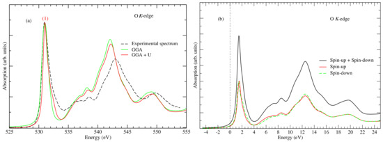 The structural parameters of the model Co 3 O 4 used for the XANES calculations have been stated in Section 2.2. Also, our calculations parameters, in particular GGA + U with U = 3.5 eV, gives a band gap value of 1.72 eV in excellent agreement with the experiment band gap E g = 1.60 eV [24,25]. Ordinary GGA (i.e., without the inclusion of U) gives E g = 0.34 eV. This is consistent with the well-known shortcomings of GGA and the LDA functionals, i.e., an underestimation of the bandgap in semiconductors [26,27]. The GGA + U is computationally frugal while providing a better description of the electronic structure of Co 3 O 4 relative to the ordinary GGA, as has been shown for similar oxide materials [28]. The right-hand panel of Figure 2 shows the band structure of Co 3 O 4 showing the clear difference between the GGA and the GGA + U bands and the relative accuracy of the latter. Nevertheless, we have performed the calculations of the XANES spectra calculation with both the GGA and GGA + U to determine the possible effect of the U on the spectra. Figure 3a shows the comparison between the experimental and computed oxygen K-edge XANES spectra. We observed no major discrepancy between the calculated spectra, in particular the positions and the intensity of the peaks are similar. Therefore, henceforth, our analysis will be based on spectra obtained with the GGA + U. In Figure 3b, spin-polarized O K-edge XANES spectra are presented. These spectra have been obtained by averaging the XANES O K-edge of all oxygen atoms in the elementary cell. Firstly, we observe good agreement between the computed and experimental spectra in that they have a common intense pre-edge peak at about 531 eV (marked as peak (1) in the figure). Also, our XANES spectra (computed and calculated) are also consistent with earlier studies by van Elp et al. [29], of the electronic structure of Co 3 O 4 crystal as obtained via the X-ray absorption studies and model cluster calculations. Beyond the pre-edge peak, there is also a good agreement between the position of the major peaks save for a small relative shift. Also, as shown in Figure 3b, the spin-up and spin-down XANES spectra are similar and their superposition results in the calculated XANES O K-edge spectrum. Thus, the XANES spectra are not spin-dependent.