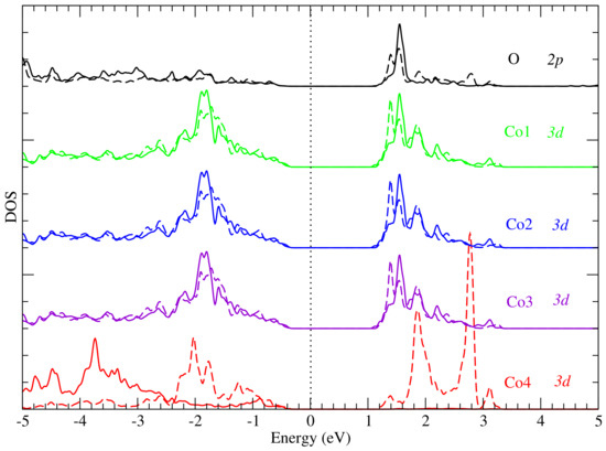 To gain deeper insight particularly into the origin of the pre-edge peak, we considered four cobalt atoms Co1, Co2, Co3 and Co4 (see Figure 2), which are bonded to the photon-absorbing oxygen atom. The cobalt atoms Co1, Co2 and Co3 have octahedral geometries (local point group O h ) while Co4 has a tetrahedral geometry (local point group T d ). For these atoms, we have plotted the partial densities of state (PDOS) separately in Figure 4. From this figure, one notices the similarity in the PDOS of Co1, Co2 and Co3, which is expected, since their local environment has the same symmetry relative to the O atom. Also, the PDOS plot shows a strong hybridization between the unoccupied Co 3 d and the oxygen 2 p states (above the Fermi level). When compared to the XANES spectra (i.e., Figure 3a), this energy range of hybridization corresponds to between 530 and 534 eV in Figure 3a. Thus, the pre-edge peak can be ascribed to dipole transitions from O 1 s to O 2 p states with the latter being hybridized with the unoccupied 3 d states belonging to cobalt atoms Co1, Co2, Co3 and Co4, since they are bonded to the photon absorbing oxygen atom. Furthermore, the hybridization is stronger for the cobalt atoms Co1, Co2 and Co3 than for Co4, as shown by the PDOS plots in Figure 4. A possible explanation for this observation is that the O−Co4 bond is slightly longer than the other three Co−O bonds [29] which may suggest a smaller degree of bonding and thus hybridization between the oxygen and Co4 atom.
