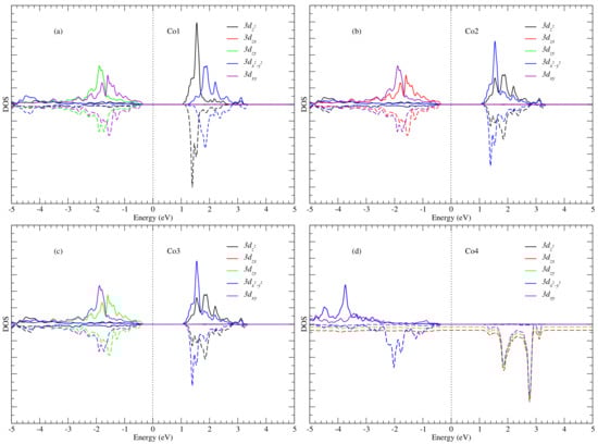 By performing orbital-projected density of states calculations, we are able to deduce the oxidation states of the Co atoms. In Figure 5, we present the projected DOS for the 3 d x y , 3 d z x , 3 d z y , 3 d z 2 and 3 d x 2 y 2 bands. The DOS of Co atoms can be categorized into two groups, namely (i) the DOS of Co atoms in the octahedral sites, i.e., the trio of Co1, Co2 and Co3 and (ii) the DOS of Co4 located in the tetrahedral site. One can see that the orbital projected DOS for the two categories are different (Figure 3). Figure 5a–c, however, show that the XANES O pre-edge peak originates from contributions from 3 d z 2 and 3 d x 2 y 2 spin-up and spin-down orbital states of Co1, Co2 and Co3. This implies that the two orbitals 3 d z 2 and 3 d x 2 y 2 are empty, since they are predominant at the pre-edge peak. Thus, for Co1, Co2 and Co3, the plausible electron configuration for the d-shell is 3 d 6 , thus suggesting that the three cobalt atoms are in the oxidation state + 3 . Furthermore, according to ligand field theory [30,31,32,33] for an octahedral coordination, the splitting of d-shells give rise to an electron configuration t 2 g 6 e g 0 (see Figure 6a). This is because only the e g orbital participates in transitions occurring in the energy range containing the pre-edge peak (see Figure 5). Consequently, the Co 3 + ions are not magnetic, since all d electrons are paired, as was previously also reported by Chen et al. [34], who also used the GGA + U approach. Similar conclusions were drawn in previous studies of electronic structure [29] and magnetization in Co 3 O 4 [35].