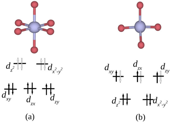 Figure 6. Cobalt geometries and the corresponding crystal-field splitting diagrams. Black filled arrows represent occupied electron states, while the hollow arrows characterize empty electron states. Bluish grey and red spheres represent Co and O atoms, respectively. (a) Co 3 + ion in the octahedral geometry (representative for Co1, Co2 and Co3) with electron configuration t 2 g 6 e g 0 , i.e., containing 4 empty 3 d states. (b) Co 2 + ion in the tetrahedral geometry (Co4) with electron configuration e g 4 t 2 g 3 , i.e., containing spin-up unpaired d electrons.