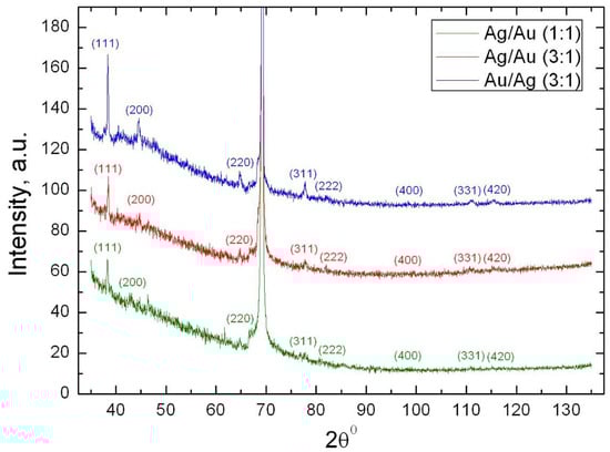 Powders X-ray diffraction (XRD) of bimetallic nanocomposites CdC8+Ag/Au NPs with different molar ratio of silver and gold (namely Ag/Au (1:1), Ag/Au (3:1) and Au/Ag (3:1) NPs), are shown in Figure 1. In addition to the intense peak from the silicon substrate (crystallographic plane (400, 2θ = 69.20°), a set of diffraction maxima corresponding to a cubic face-centered lattice, the space group Fm-3m, a = b = c = 4.08 Å, is visible for all nanocomposites. The absence of additional crystal reflexes on the diffractograms indicates that the CdC8 matrix is in a glazed mesomorphic state. The ratios of the intensities of the indexed maxima and the parameters of the crystal lattice are very close to the corresponding values for the reference samples from the COD database: for Au (card 1100138) and for Ag (card 1100136). This indicates that the particles are likely to have a three-dimensional shape that is close to spherical. According to Scherrer’s formula, the average size of bimetallic nanoparticles was estimated; their size is about 20 nm for all three samples. It is much more difficult to interpret the internal structure of such nanosized bimetallic objects. The main issues that arise relate to the distribution of components within each particle (homogeneous or gradient alloy) and the outer face (predominant crystallographic planes).