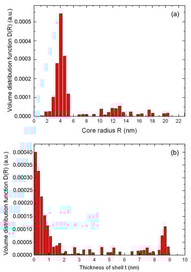 For a nanocomposite with a molar concentration ratio of nanoparticles of Ag/Au (3:1), according to small-angle X-ray scattering data, a different scenario is observed. For this sample, the core-shell structure is formed as follows. At the initial stage of chemical synthesis, due to rapid nucleation, bimetallic nanoparticles are formed from an Ag/Au alloy, after which, in the process of slow thermal diffusion, they are covered with a shell of gold atoms. As for the previous nanocomposite, the size distribution was calculated in the approximations of core-shell models. The results of the calculation by the Monte-Carlo method are obtained (Figure 3). As can be seen from Figure 3, in addition to nanoparticles with a core radius R~4.5 nm, a much larger radius R~12.5 nm was also observed in the nanocomposite. Such nanoparticles have an average radius of core Ag/Au NPs R~4.5 nm, covered by Au NPs with a shell thickness of t~8.5 nm.