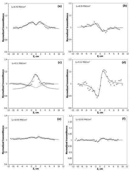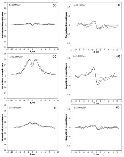A closed aperture (CA) Z-scan scheme allows the sign and magnitude of the samples’ nonlinear refractive index to be determined. Approximation of the data for CA is done using the formula [44]: