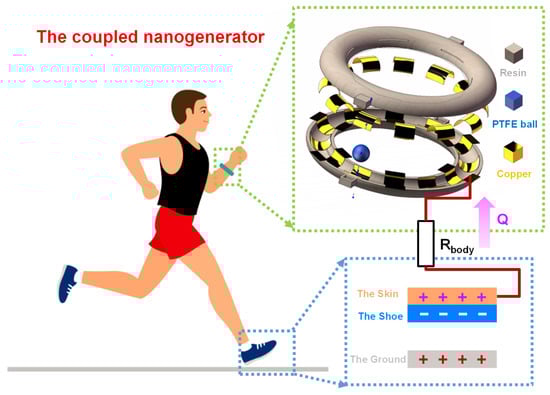An energy harvester coupled with a triboelectric mechanism and electrostatic mechanism for biomechanical energy harvesting, as illustrated in Figure 1, is proposed in this paper, which consists of two main parts: a wristband-type triboelectric nanogenerator (W–TENG) worn on the wrist, and an electrostatic nanogenerator (EENG) formed by the friction of the sole against the ground. The structure of the W–TENG, shown in the illustration, mainly consists of three parts: a 3D-printed resin ring, some cross-fingered copper foil electrodes, and a polytetrafluoroethylene (PTFE) ball. Fluorine has the highest electronegativity among almost all the elements, so the material of the ball was PTFE, which contains lots of fluorine []. Due to its strong electronic attraction, a PTFE ball can easily capture a large amount of triboelectric charges when rubbed against other materials. Meanwhile, is copper at a more positive direction than precious gold and silver in the triboelectric sequence []. Therefore, a PTFE ball and copper electrode will accumulate opposite charges after contact []. The whole device can be realized with a simple process and cheap materials which are suitable for mass production. One end of the forked-finger electrode was placed in contact with the human wrist. When the human body moved, the PTFE ball would roll on the cross-fingered electrodes in the 3D-printed resin ring with the swing of the arm, resulting in a triboelectric effect with the cross-fingered electrodes. The EENG was built by the shoe and the floor. In this structure, the sole of the shoe was not installed with any triboelectric materials. The sole and the ground produced a periodic contact—separation process with walking, and opposite charges were accumulated on each other’s surfaces. The surface of the skin can generate electric charges by electrostatic induction because of the contact with the electric shoe. By exposing one end of the electrode of the W–TENG to the human body, the triboelectric charges on the skin are transmitted to the electrode of the W–TENG. The scheme proposed in this paper does not need to place any material in the sole, and can realize the efficient acquisition of triboelectric energy between the sole and the ground when walking, which has the advantages of comfort, low cost, and long life.