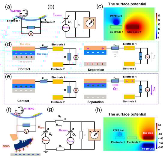 For the traditional triboelectric nanogenerator (W–TENG), its electrodes were generally shielded inside the shell, as shown in Figure 2a,b. The amount of charges accumulated on the equivalent capacitance CW–TENG was Q1 after the PTFE ball contacted with the electrodes, and the open-circuit voltage can be expressed as []: