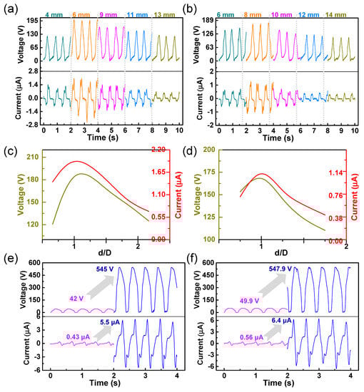 Firstly, in order to analyze the influence of the relationship between the diameter of the PTFE ball and the width of the electrode on the electrical performance of the C–ENG in the state of a human walking with swinging arms, PTFE balls with diameters of 6 and 8 mm were selected as test objects. The output voltages and currents of different electrode widths (4 mm, 6 mm, 9 mm, 11 mm, and 13 mm), with a PTFE ball with a diameter of 6 mm, were measured respectively, as illustrated in Figure 3a. The output voltages and currents of different electrode widths (6 mm, 8 mm, 10 mm, 12 mm, and 14 mm), with a PTFE ball with a diameter of 8 mm, are illustrated in Figure 3b. Figure 3c further analyzes the maximum voltage and current in Figure 3a. Its abscissa represents the ratio of electrode width (d) to PTFE ball diameter (D), and the ordinates on both sides represent the maximum voltage and current under different electrode widths. It can be seen that, when the ratio approached one, both the voltage and current reach their maximum values. The same result is obtained in Figure 3d. These results show that the best electrical properties were obtained when the electrode width was approximately the same as the PTFE ball diameter. After obtaining the above results, the electrical properties in jumping state were analyzed. The voltage and current values were measured when the electrode was not in contact with the human body (W–TENG) and when it was in contact with the human body (C–ENG) respectively. As seen in Figure 3e, when the electrode width was 6 mm and the diameter of the PTFE ball was 6 mm, the output voltages of the W–TENG and C−TENG were 42 V and 545 V respectively. It proves that the output voltage increased by, approximately, 12.98 times by coupling the mechanism of electrostatic. The maximum current correspondingly increased from 0.43 to 5.5 µA. Similarly, it can be seen from Figure 3f that when the electrode width was 8 mm and the diameter of the PTFE ball was 8 mm, the output voltage showed the same increasing trend. The results show that coupling the electrostatic mechanism can effectively improve the energy conversion efficiency of the nanogenerator, which is the same as in the theoretical analysis. In addition, all tests were conducted on the dry ground. This is because, in a dry environment, the sole and the ground can generate more triboelectric charges, which was conducive to verifying the coupling enhancement theory proposed in this paper.