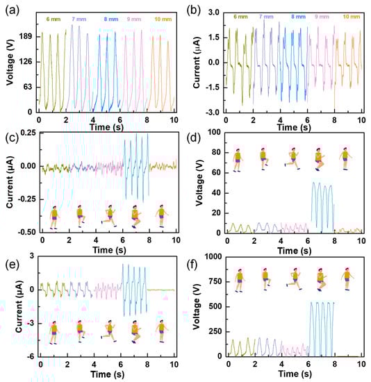 In order to further study the influence of the diameter of the PTFE ball on the outputs, other sizes (7 mm, 9 mm, and 10 mm) were measured, under the condition that the size of the PTFE was equal to the width of the electrode, and the measured results were compared with those obtained previously at 6 mm and 8 mm, as illustrated in Figure 4a,b. As seen in the two figures, the diameter of the PTFE ball had no obvious effect on the outputs. This may be because, although the diameter of the ball changed, the total triboelectric area did not significantly change. Through the analysis of the measured experimental data, it can be concluded that the size combination of 7 mm is more suitable for subsequent experiments. As the signals generated in different motion states were different and the corresponding application occasions were also different, the signals in different motion states were recorded, such as walking without swinging arms, walking with swinging arms, running, jumping, and swinging arms only (as illustrated in the accompanying Supplementary Video S1). The voltage and current signals of the W–TENG (Figure 4c,d) and C–ENG (Figure 4e,f) were measured respectively. It can be seen from Figure 4c–f that both voltage and current show the maximum amplitude in the jumping state. The frequency of outputs measured in the running state are obviously higher than that in other states, but the amplitude of outputs decreased to a certain extent. This is because the triboelectric area of the sole with the ground was reduced in the running state. Through a comparison, it can be seen that the detection ability of the C–ENG for the five states is significantly better than the W–TENG. This is because the output performance of the device was greatly improved by coupling the electrostatic induction mechanism. The experiment proved that the C–ENG showed higher resolution for motion states compared with the conventional triboelectric nanogenerator and can precisely and constantly monitor and distinguish various motion states, including stepping, walking, running, and jumping.