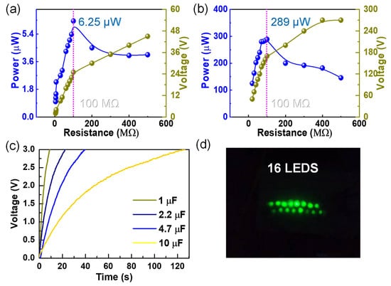 According to the previous results, it is evident that the ouput voltages and currents of the C–ENG were greatly improved compared with those of the W–TENG. The enhancement in peak output power was further studied in walking condition. As illustrated in Figure 5a,b, the peak output power of the W–TENG and C–ENG were measured respectively, and the maximum values and corresponding impedance were marked. A sustainable and enhanced peak power of approximately 289 μW was produced for the C–ENG when the external impedance was 100 MΩ, which gave over a 46-fold enhancement to the conventional single triboelectric conversion mechanism (6.25 μW for W–TENG). Subsequently, the charging rates for different capacitors (1.0 μF, 2.2 μF, 4.7 μF and 10 μF) were studied to verify the excellent output of the C–ENG, as presented in Figure 5c. It is evident that the larger the capacitance, the longer the charging time, which is consistent with the theoretical basis. Furthermore, 16 LEDs were lit in a series to verify the excellent electrical output of the C–ENG, as illustrated in Figure 5d and Supplementary Video S2.