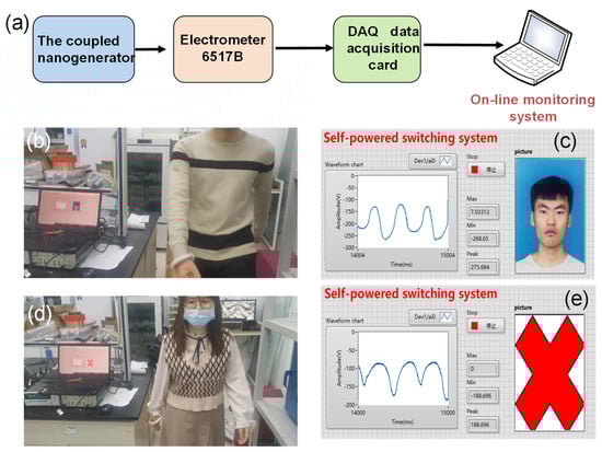 To demonstrate that the C–ENG can serve as a sensing device for actual scenarios, a self-powered switching system was invented. The system was constructed of the coupled nanogenerator, an electrometer 6517B, a DAQ data acquisition card, and an online monitoring system, which is expressed in Figure 6a. To demonstrate this function, the C–ENG was worn on the wrist to record the voltage waveform output by different people swinging their arms on foot, while simultaneously measuring the maximum and minimum voltage values and calculating the corresponding peak to peak voltage values. The measurement process is illustrated in Figure 6b–e. When the system recognized that the gait information of a person was passable, the information was retrieved from the library and the access control was opened to allow the person to enter, as illustrated in Figure 6b,c, and Supplementary Video S3. In contrast, if the system recognized that the gait information of the personnel was not in the passable range, it called up the blocking command, so as to prevent the invasion of foreign personnel, as illustrated in Figure 6d,e, and Supplementary Video S4. It is worth noting that this part was only a general functional demonstration and the specific application of C–ENG in switching systems needs to be further improved.
